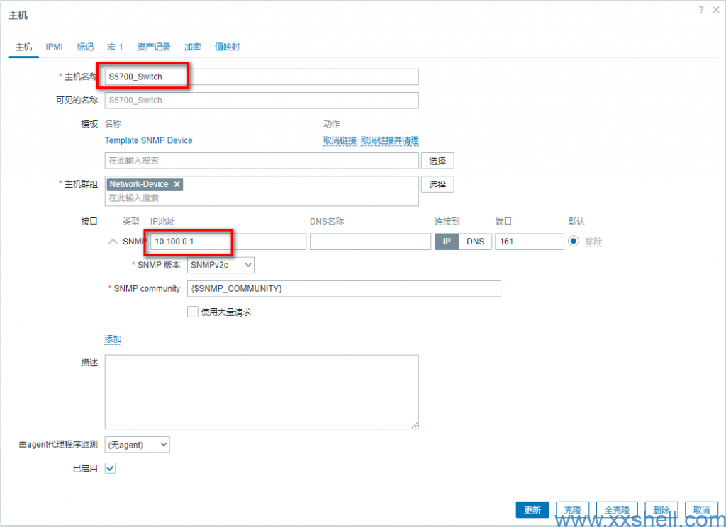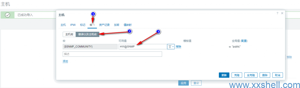 3、修改刚刚导入的主机,修改宏-继承以及主机宏中的"{$SNMP_COMMUNITY}"的public修改为你设置的snmp读团体字;