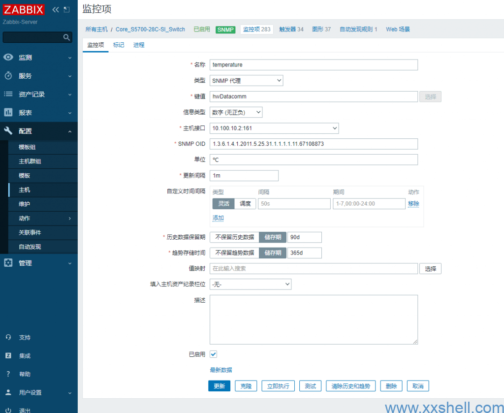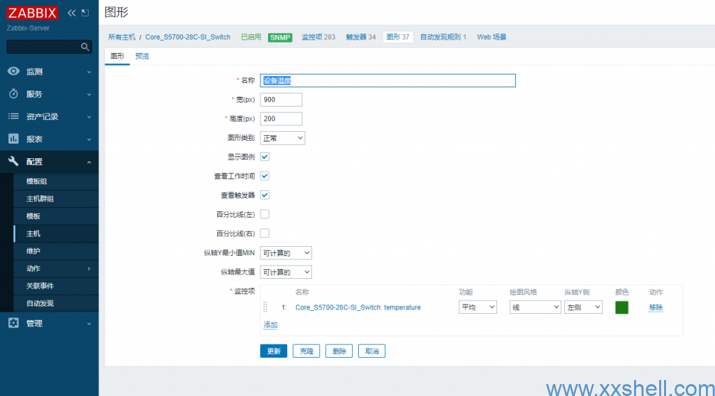 本监控脚本囊括了基本的监控项,如果你有特殊的监控项目,则你需要手动添加监控项和图形,进行展示,这里我以监控华为交换机设备温度截图展示;