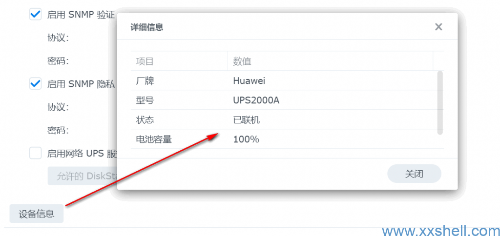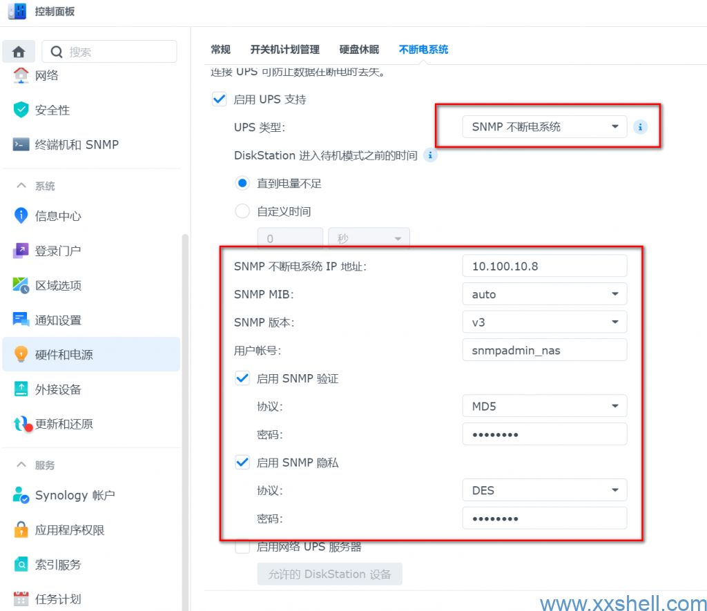 2、配置群晖UPS支持,找到设置-硬件和电源-不断电系统,选择UPS类型为“SNMP不断电系统”,填写SNMP01B管理卡的IP,MIB为auto,版本为v3,并填写下面的认证信息,点击保存
