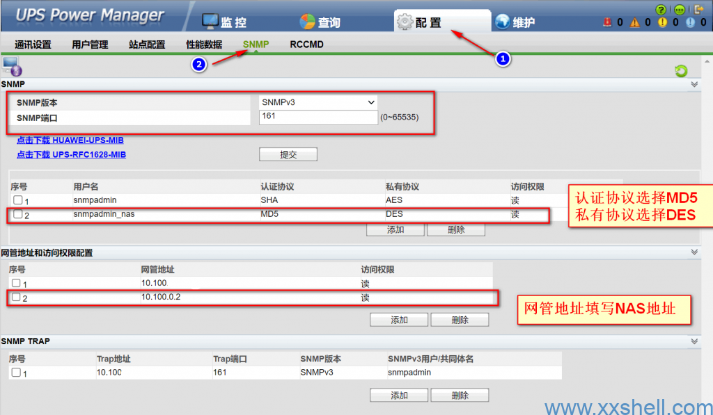 ①配置SNMP版本为SNMPV3、SNMP端口为161(管理卡与NAS之前有防火墙需要放行udp161流量);