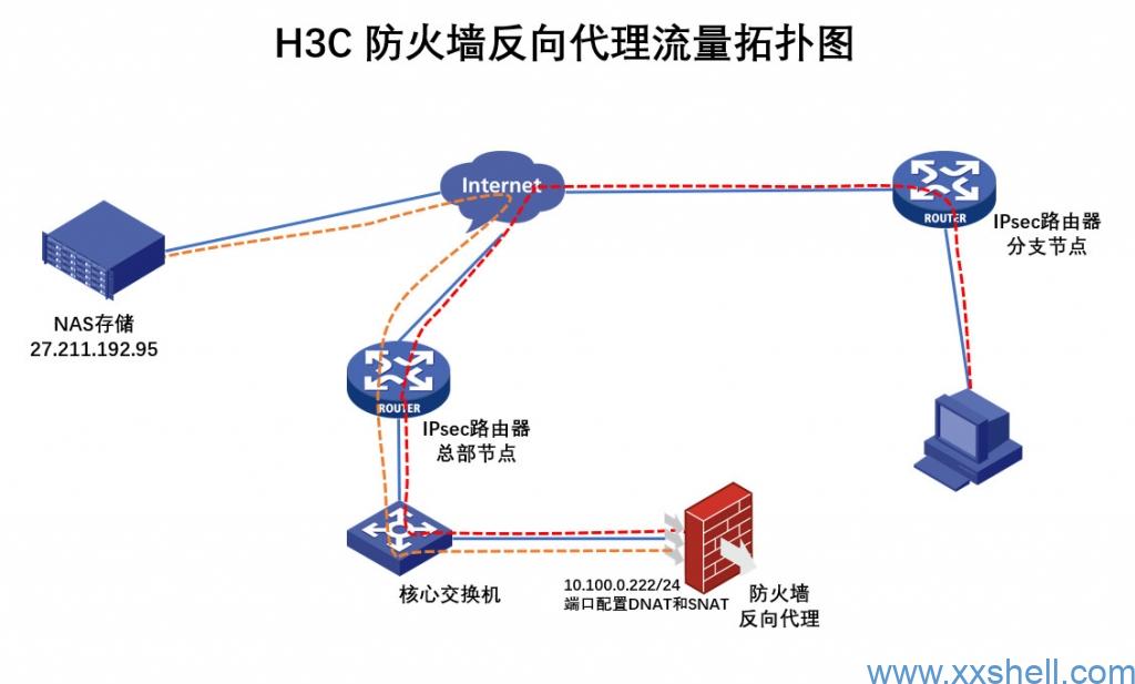 因互联网存储限制公网源地址访问,而分支节点网络也需要访问NAS存储,但是直接访问存储是没有办法访问的,所以说我们就需要通过总部节点的公网地址代理访问NAS服务器。所以我们这里就通过H3C F100-E-G2防火墙进行代理访问,因防火墙服务器负载均衡功能是需要license授权才可以开启,所以说我们通过DNAT和SNAT叠加进行双向NAT解决该问题,当然通过NAT策略也是同样实现该功能的,这里我们演示一下前者的技术方案,具体流量模型如下。