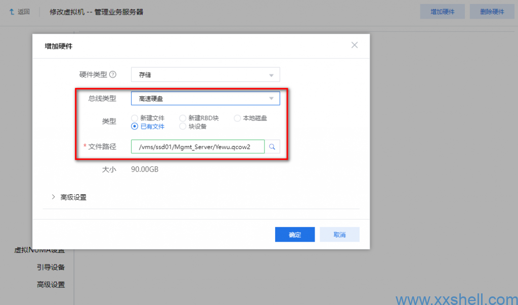 11、将虚拟机挂载的硬盘删除,并重新挂载该镜像,这次挂载的时候,总线类型选择高速磁盘,找到原有的qcow2磁盘文件,设置完成后点击确认,并检查引导设备高速磁盘是否为第一启动项,如果不是第一启动项则拖拽到第一启动项中。然后启动虚拟机。