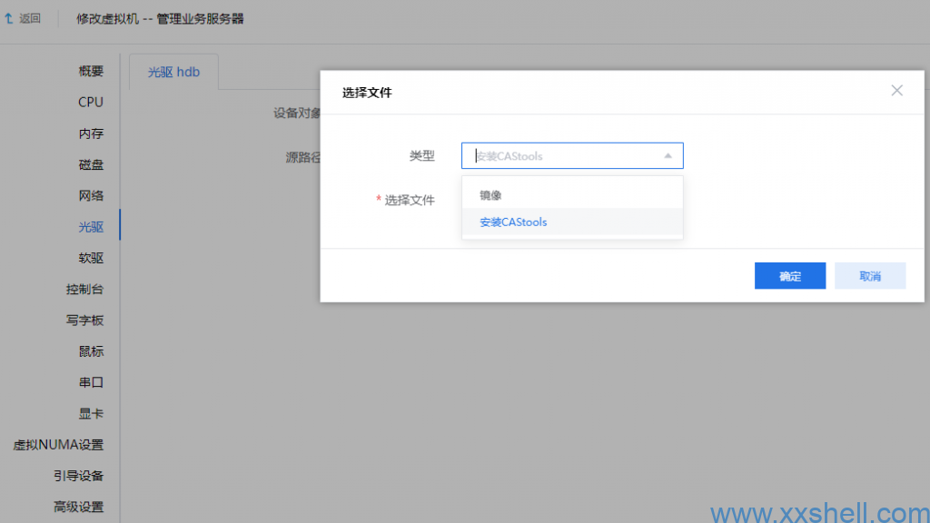 9、启动虚拟机,然后将CAS tools挂载到虚拟机上,如果原有虚拟机启动方式为UEFI模式启动则需要在虚拟机-修改-引导设备中,将BIOS引导修改为UEFI引导。