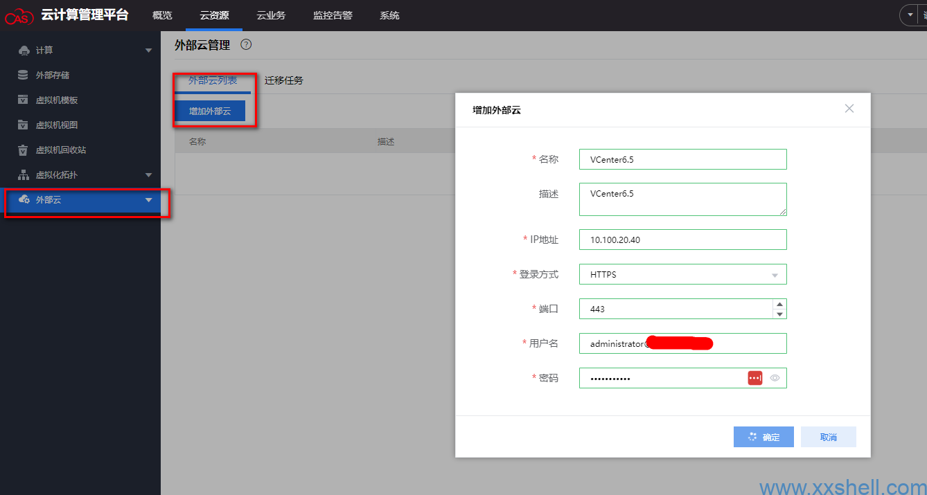 1、在H3C CAS虚拟化管理平台添加通过外部云添加VMware VCenter服务器,接管虚拟化平台;