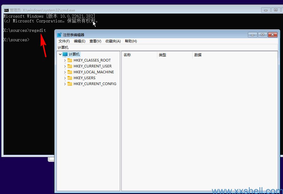 1、按 Shift + F10 打开命令行,运行regedit,打开注册表;