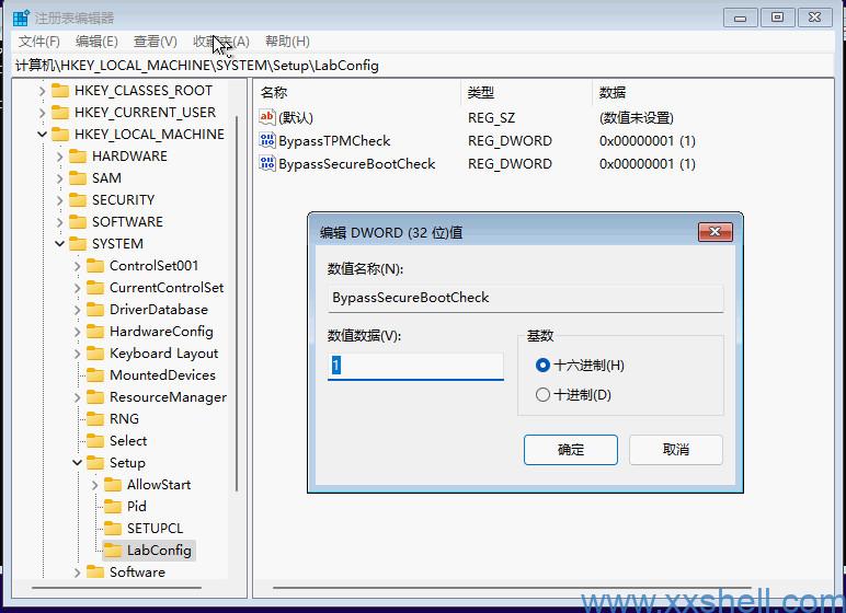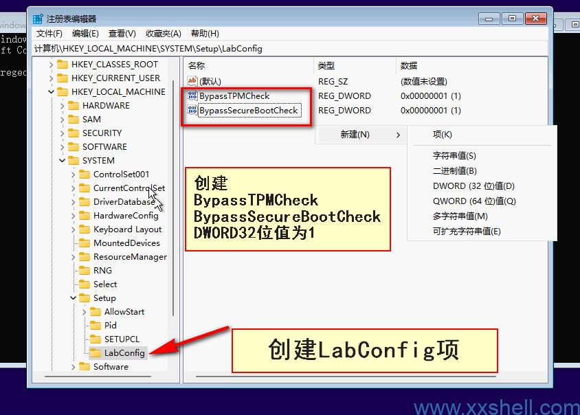2、打开“计算机\HKEY_LOCAL_MACHINE\SYSTEM\Setup”创建 "LabConfig"项,并在该项下新建BypassTPMCheck和BypassSecureBootCheck的DWORD32位值,值位1,如下图: