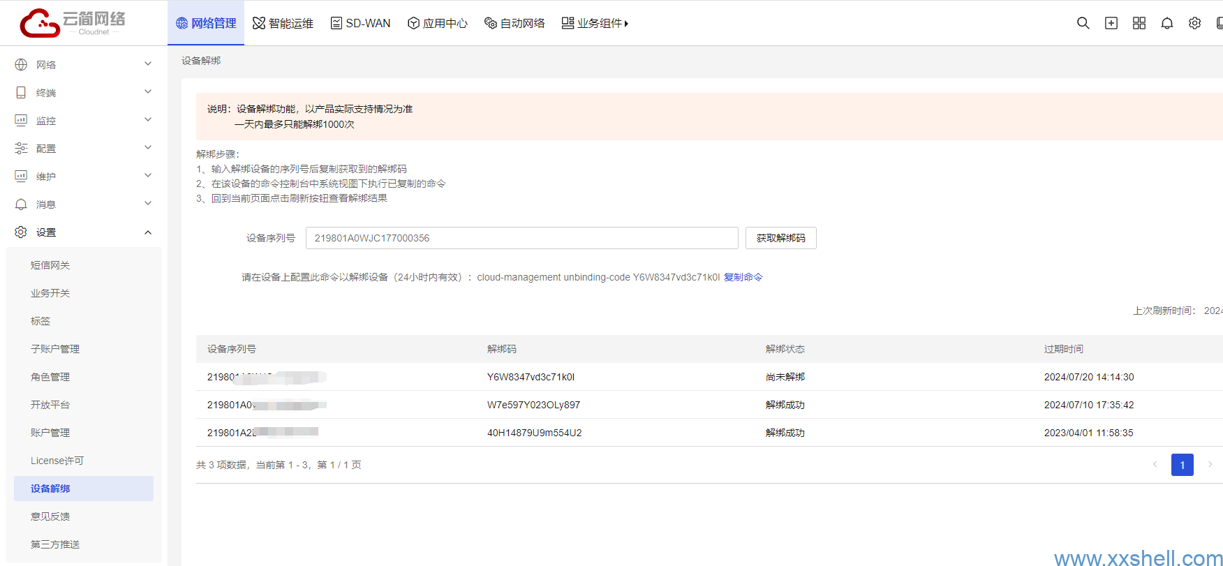 3、登录设备命令行执行下面命令(Y6W8347vd3c71k0I为解绑码,解绑码24小时内有效);cloud-management unbinding-code Y6W8347vd3c71k0I