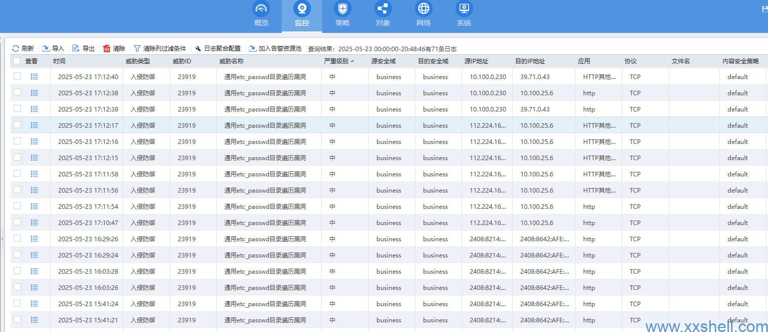 深度包检测防火墙部署完成一段时间发现只有一个业务地址段的流量出现告警日志,通过IPS测试语句发现 http://www.h3c.com/etc/passwd 无法触发带有VLANID的业务地址段。